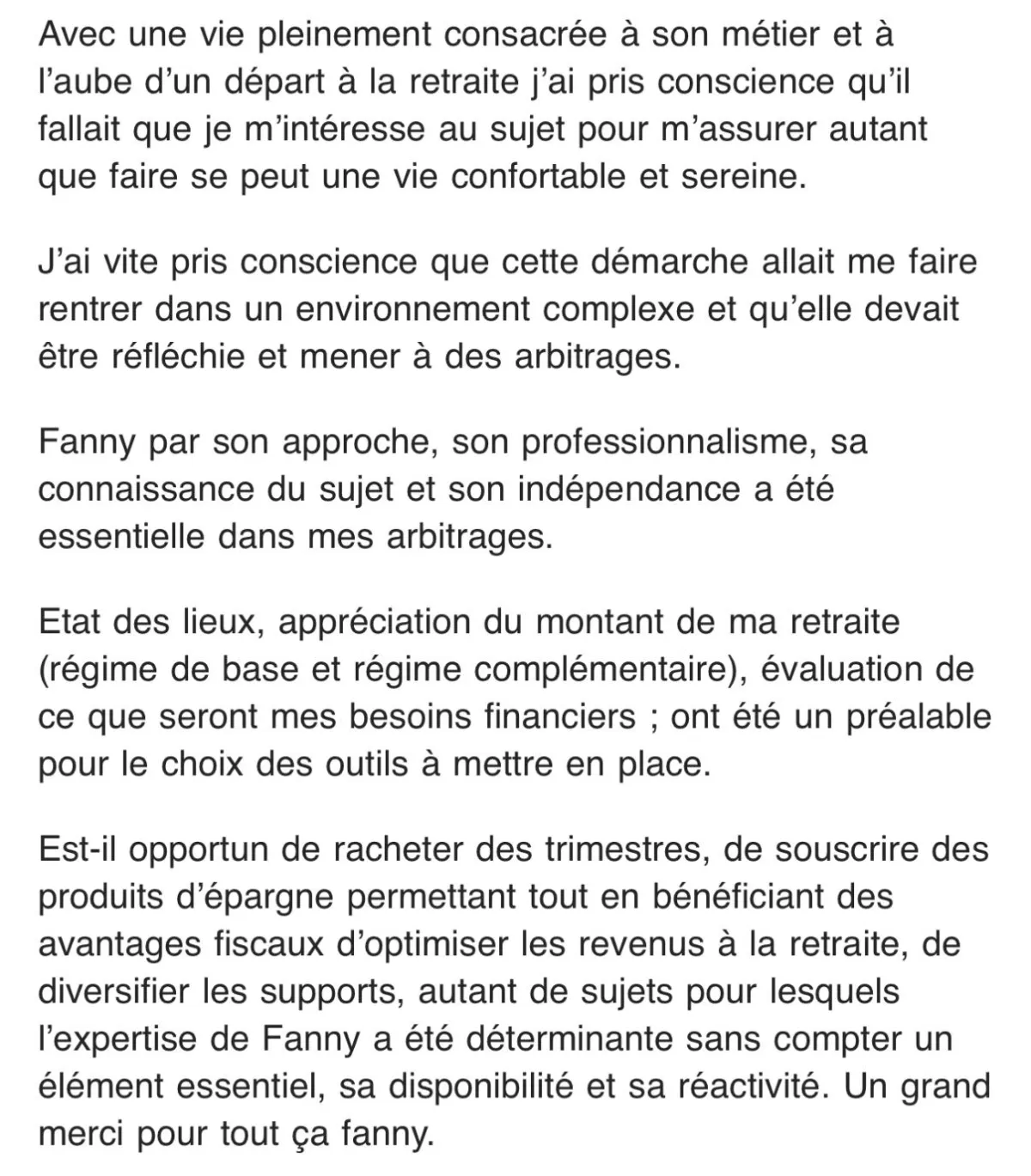 "Je tenais encore une fois à t'exprimer toute ma confiance pour l'accompagnement exceptionnel que tu nous apportes dans le cadre de nos dossiers de retraite et d'épargne. Nos échanges sont toujours enrichissants, et j'apprécie particulièrement la clarté de tes explications ainsi que ton professionnalisme.